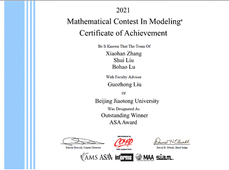 2021年美国大学生数学建模竞赛结果已揭晓,在学校教务处和理学院的支持下,我校学子由理学院王兵团教授数学建模团队精心组织指导,首次获得此次美国大学生数学建模竞赛的美国统计学特别奖(ASA Award),这是美国统计学会为该项赛事设定的唯一一个冠名奖,被认为是该项赛事的最高奖之一。本届竞赛我校共获得1项特等奖(Outstanding Winner)、5项特等提名奖(Finalist)、15项一等奖(Meritorious Winner)、45项二等奖(Honorable Mention)的好成绩,获奖成绩取得历史突破!近5年来,我校在这项赛事无论在获奖规模和成绩水平方面不断提高,标志着我校学子的数学建模水平进入新台阶!