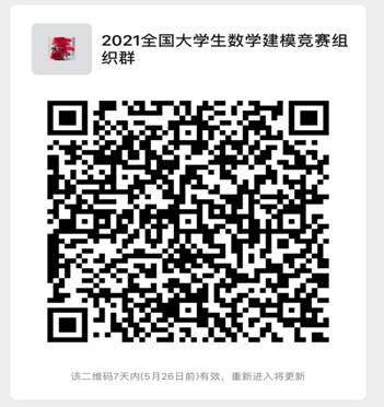 友情提示:2021 年全国大学生数学建模竞赛将在9月9日至9月12 日进行,为使同学了解该竞赛,将建立2021全国大学生建模竞赛组织微信群。感兴趣的同学可以用下方的竞赛微信群二维码进入竞赛组织群。为杜绝微信群爆满,请参赛各队每队只派一人入群。我们将在5月30日下午3:00-4:00在微信群介绍竞赛并回答同学们的问题。