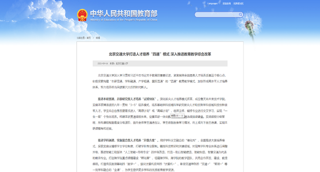 9月16日,教育部网站在“一线采风”栏目专栏发布了《北京交通大学打造人才培养“四通”模式