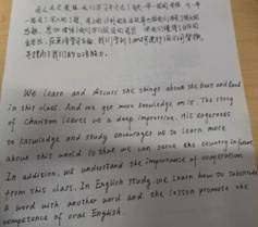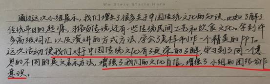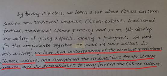 学生以小组为单位,全部参与了该活动。经过精心的准备,每个小组都在课堂上进行了精彩的展示。选择话题时,同学们回顾了大量的中国文化标志,惊叹于中国文化的博大精深;准备材料时,深入挖掘了中国文化的内涵。通过这次活动,同学们增强了民族自豪感和文化自信。