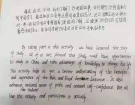 总结:学生对于沙利的故事非常感兴趣,在问答环节参与、投入度较高,并欣慰于沙利在“一带一路”公益基金项目的资助下获得了免费来华求学的机会,可以踏踏实实的坐在课堂上专心学习。“一带一路”很大,涉及到上百个国家,“一带一路”也可以很小,关乎到沿线国家的每一位普通人。通过对沙利这样一个真实故事的关注,引发了学生对“一带一路”的思考:“一带一路”倡议正切实地惠及世界。通过讨论一带一路,学生对中国所展现的大国担当深有体会,增强了民族自豪感。实现自己的梦想并帮助别人是中国正在做的,也是学生们将来愿意做的:为祖国发展做贡献,并帮助其他人走出贫困。