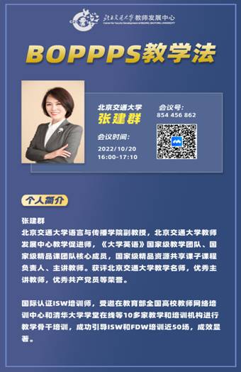 2022年10月20日下午,本科生院教师发展中心邀请教学促进师张建群副教授面向我校托管帮扶的内蒙古甘旗卡第二高级中学和陕西麟游县中学开展了主题为“BOPPPS教学法”的专题培训。