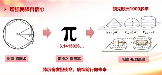 我们在数学课程教学中注重挖掘国内数学家和科学家的家的例子。在讲解微积分中的定积分应用——球的体积公式时。中国古代数学家刘徽、祖冲之和祖暅计算了球的体积。刘徽首先研究了牟合方盖,创造了割圆术。之后祖冲之利用割圆术计算了圆周率的值,精确到小数点后第7位。最后,祖冲之的儿子祖暅给出了祖暅原理,从而求出了球的体积公式。祖暅原理不仅仅增强了民族自信心,展示了我国古代数学的传承。这种传承精神也是一个很好的思政元素,可以引申为踔厉奋发担使命,赓续前行向未来。