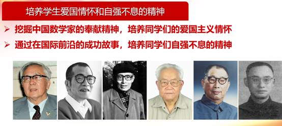 4)爱国自强。就是通过数学课程培养学生爱国情怀和自强不息的精神。通过挖掘中国数学家的奉献精神,培养同学们的爱国情怀。比如华罗庚放弃美国优越条件,克服重重困难回到祖国怀抱,投身我国数学科学研究事业,创立数学所;陈景润在十分艰苦的条件下攻克哥德巴赫猜想的“1+2“问题;周毓麟院士为了祖国的需要三次转换研究方向等。通过数学家在国际前沿中的成功故事,培养同学们自强不息的精神。比如吴文俊先生在中国古代数学思想指引下,在数学机械化方面独辟蹊径,国际领先,被称为吴方法。廖山涛先生在艰苦的环境下,独立研究,在动力系统方面独创阻碍集方法,世界领先。陆家羲先生克服病痛,独立耕耘,在组合数学方面解决了世界难题,成果在国际领先。