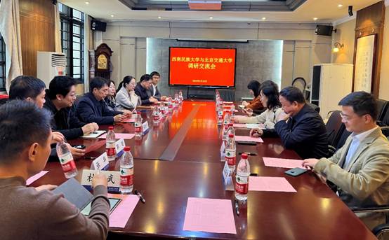 荆涛代表学校对麦贤敏一行来访表示热烈欢迎,并简要介绍了学校的历史沿革、办学规模、以交通为特色的学科体系和人才培养体系,希望与西南民族大学加强交流互鉴,促进共同发展。