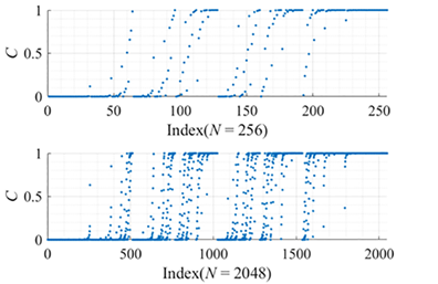 随着码长N = 2n增大,子信道的信道容量逐渐向C(W) → 0和C(W) → 1变化。以BEC为例,如图3所示,随着码长增大,信道容量趋向于极端的子信道占比越高。利用这个现象,选择无噪信道传输信息,而另一部分的纯噪信道设置为已知比特。增大码长有利于传输信息,同样会增加编译码系统的复杂度,同时应该考虑编译码复杂度的问题。
